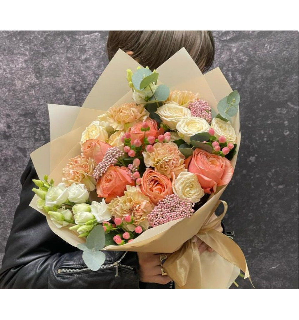 Пионовидные розы и озотамнус в этом букете образуют прекрасное сочетание изящества и свежести. Многослойные лепестки пионовидных роз придают ему особый шарм, а ароматный озотамнус добавляет приятные ноты. Этот уникальный букет создаст атмосферу романтики и красоты, станет чудесным подарком для особых моментов и создания незабываемых впечатлений с вашими близкими.